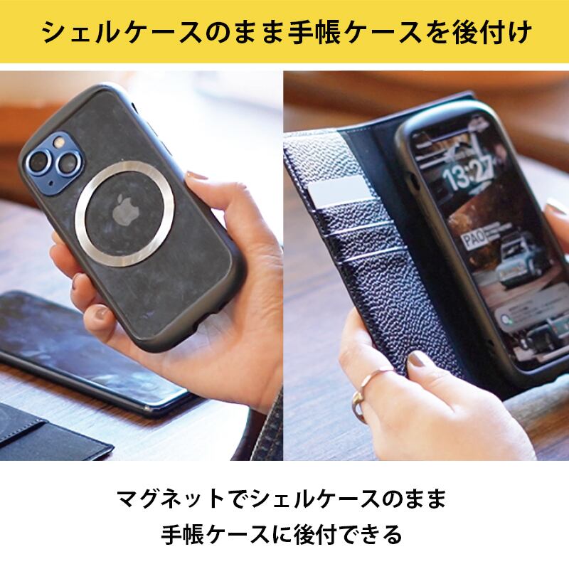 MagSafeに対応したシェルケースや、付属のメタルシールを使うことで、お使いのシェルケースを装着したまま、手帳ケースを後付けしてご利用できます。※シェルケースの厚みによっては対応できない場合があります。