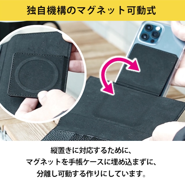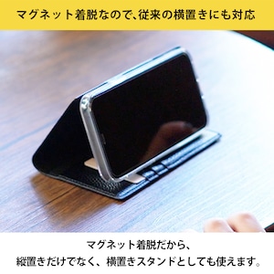 マグネット手帳ケースは、縦置きスタンドに特化した手帳ケースです。マグネット着脱の利点を活かして、横置きにも瞬時に対応。4.7〜6.3インチまでのiPhoneやandroidスマートフォン等で、汎用的に手帳ケースとして使えます。カメラ穴を閉じた設計なので、徹底的にレンズを保護します。スマートフォンにシェルケースを装着したまま、後付けで手帳ケースを装着可能です。