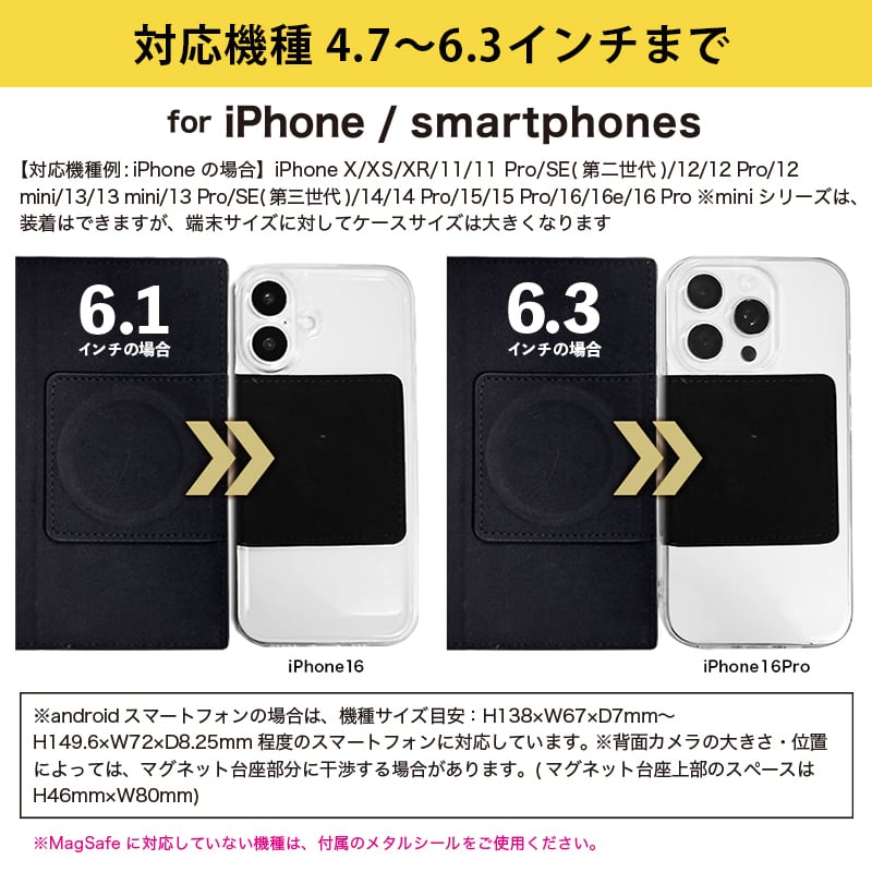 iPhone機種だけに限らず、4.7〜6.3インチまでのスマートフォン全般に対応します。【対応機種例:iPhoneの場合】iPhone X/XS/XR/11/11 Pro/SE(第二世代)/12/12 Pro/12 mini/13/13 mini/13 Pro/SE(第三世代)/14/14 Pro/15/15 Pro/16/16e/16 Pro ※miniシリーズは、装着はできますが、端末サイズに対してケースサイズは大きくなります。※androidスマートフォンの場合は、機種サイズ目安:H138×W67×D7mm〜H149.6×W72×D8.25mm程度のスマートフォンサイズに対応 ※背面カメラの大きさ・位置によっては、マグネット台座部分に干渉する場合があります。(マグネット台座上部のスペースはH46mm×W80mm)