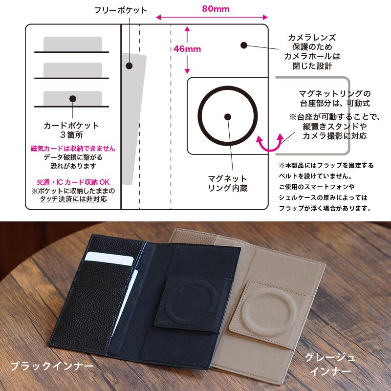 ●本製品は落下による破損防止を保証するものではありません。 本製品を使用しての事故や故障、データの損失などに関しては、当社では一切の責任を負いかねます。●本製品をご利用の際は、必ずシェルケースと併用してお使いください。 ●本製品を用途以外の目的には使用しないでください。 ●時計/磁気カードのような外部からの磁気影響を受けるものを、本製品のマグネット部分へ直接近づけないでください。 故障の原因となります。 ●カードポケットに磁気カードを収納しないでください。データ破損の原因となります。交通・ICカードはご利用できますが、ポケットに収納のまま、タッチ決済には非対応となっています。●高温、多湿、直射日光の当たる場所など環境変化の大きな場所での長期保管はしないでください。 商品劣化の原因となります。 ●ご使用状況や環境などにより、変色する場合があります。 ●幼児の手の届かない場所へ保管してください。イラストや写真はイメージです。 実際の商品とは異なる場合があります。 ●デザイン/仕様などは改良のため予告なく変更する場合があります。●収納するカード枚数やお使いのスマートフォン機種、ご使用しているシェルケースによってはフラップが盛り上がる場合があります。あらかじめご了承ください。