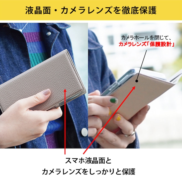 カメラ穴を完全に閉じた設計のため、カメラレンズの徹底保護した設計となっています。※手帳を開くことで、カメラ撮影に対応。