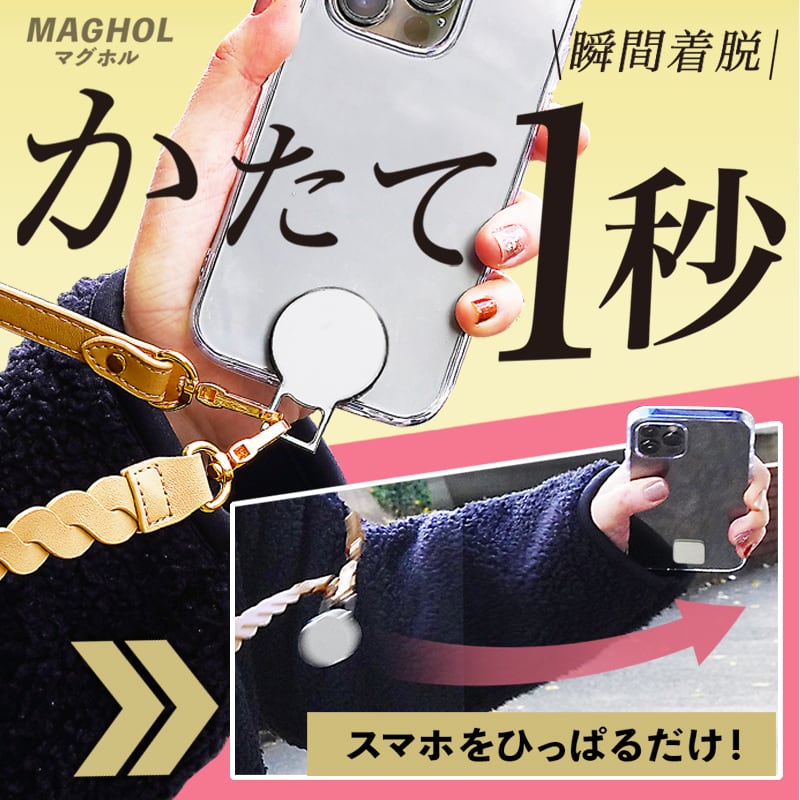 MAGHOL(マグホル)は、スマホショルダーストラップをマグネット取付構造する、マグネット式ストラップホルダーです。スマホとストラップを瞬間着脱できるので、レジ前で「ちょっとスマホを外して」決済したい時や、帰宅時のスマホの着脱がとっても快適に。ショルダーストラップに限らず、バッグやリュックでも使え、スマホを「手軽」に身につけることが可能になります。iPhoneやandroidスマートフォン全般でご利用できます。